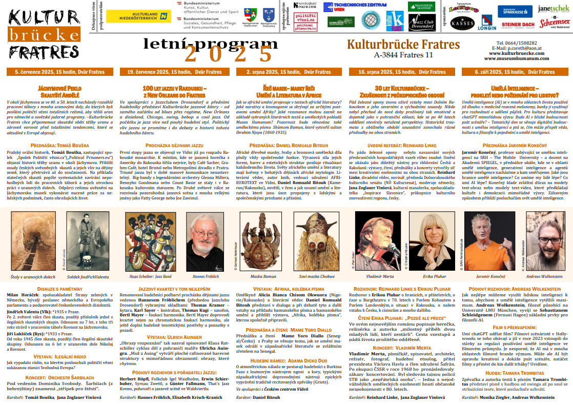 Po pádu železné opony nebylo navazování nových přeshraničních hospodářských vazeb vůbec snadné. Umění se ukázalo jako důležitý nástroj pro sbližování Čechů a Rakušanů: výstavy, čtení, přednášky a koncerty vytvořily síť mezi kreativními osobnostmi na obou stranách. Reinhard Linke, divadelní vědec, novinář, předseda Dolnorakouského kulturního senátu (NÖ Kultursenat), moderuje německy, Jana Zoglauer Vinšová, kulturní manažerka, spoluzaklada telka „Inspirace Slavonice“, průkopnice kulturního znovuoživení regionu, česky.
